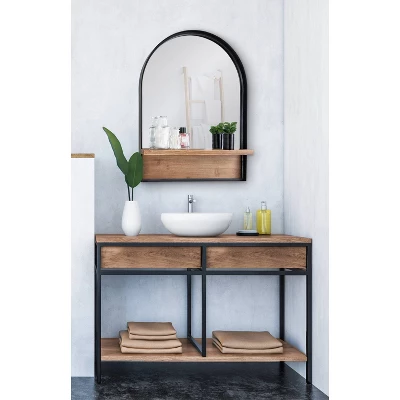 Combine your love of farmhouse decor with sophisticated, modern design with the Owing mirror from Kate and Laurel. The Owing wall mirror features a windowpane-inspired arch shape, constructed with a resilient metal frame. This mirror is not only sophisticated and decorative, but also features a 3.5-inch ledge constructed of solid, hand-distressed wood. This robust wood shelf is excellent for display photos, small succulents, or candles. You could even situate your soaps and lotions on the ledge if you choose to hang this mirror as a single or double vanity. The Owing farmhouse mirror has the overall display dimensions of 32 inches tall by 24 inches wide with a 2-inch depth. These dimensions make it a bold display in any modern farmhouse living room, bedroom, entryway, dining room, or sunroom. Adding a decorative mirror to your living space increases the amount of light throughout the room, creating a more open, dimensional concept. This mirror assembles in only a couple of steps with easy to follow instructions. When you’re done putting it together, the hooks on the back of the Owing wall mirror make it a quick and easy installation process.