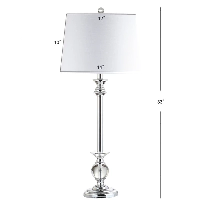 Refresh your decor with this striking crystal and chrome table lamp. The modern look features a slightly tapered shade atop a clear crystal and chrome base that conceals the wiring within. A clear winner, this lamp stands out for its finishing touches — a crystal finial, chrome fittings, and a 60″ silk-wrapped cord complete the look.