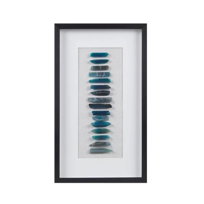 Elevate your home decor with the bold style of our Martha Stewart Cerulean Stones Framed Blue Agate Shadowbox Wall Decor Panel. This shadow box wall art features 100% genuine agate stones that are uniquely cut and placed under glass, for a opulent and modern look. Each stone is carefully arranged on a single matte base creating a gallery look and feel, while the Black MDF frame adds a striking complementary and updated touch to the design. The reverse features 4 D-rings, making it easy to hang this framed wall art either vertically or horizontally fitting to any decor or space. Colors and shapes of agate may vary from image due to the natural properties of each agate stone, making each piece exclusively unique.