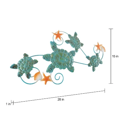 Bring some beach chic to your home with this Hastings Home Sea Turtles Wall Art. This 3D metal wall hanging features four swimming sea turtles with accents of scrolled waves, starfish, and seashells, making it the perfect piece of decor to add to any room. The 3D construction adds structure to your decor, and it’s hand-painted so each hanging has a unique, handmade feel.