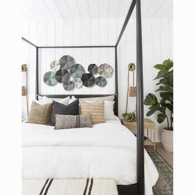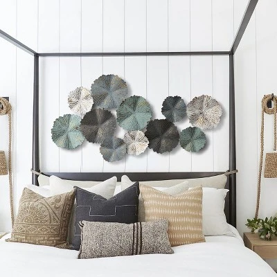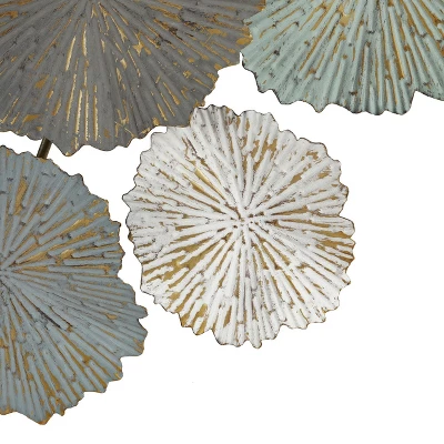 Dress up your wall with this stunning, handcrafted, floral-inspired wall sculpture. Eleven round flowers are connected and overlap making this is a beautiful handcrafted metal wall flowers in lovely soothing tones of gray, blue, green, and white. Each flower is purposefully distressed with gold accents that give the art piece depth and texture. At 48.4″x23.6″ in size, this wall decor arrives ready to mount to your bedroom, dining room, entryway, or office wall, and makes an impressive statement that is visually appealing and is substantial to use as a focal point of your wall, or as an accept piece in your room.