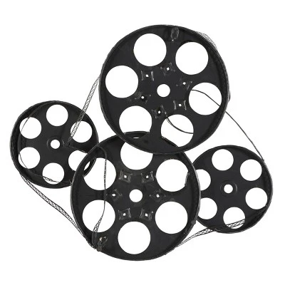 - Four movie reels with distressed finishes for a vintage look in gold, silver, and brown colors, black metal film strip winds around the reels for a 3D look