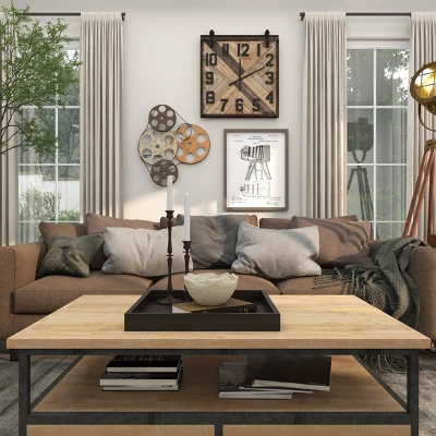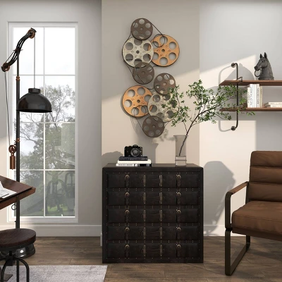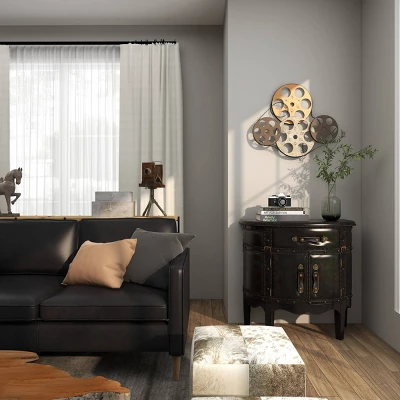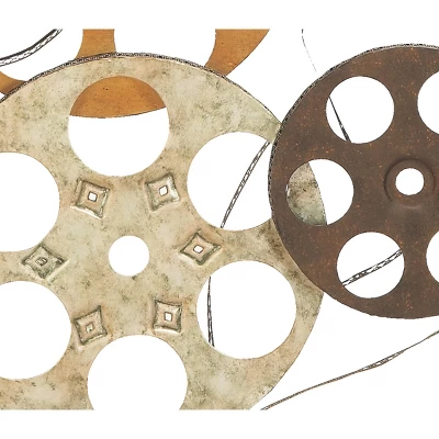 - Metal wall decor with gold, silver and brown film reel sculptures with black film strip
