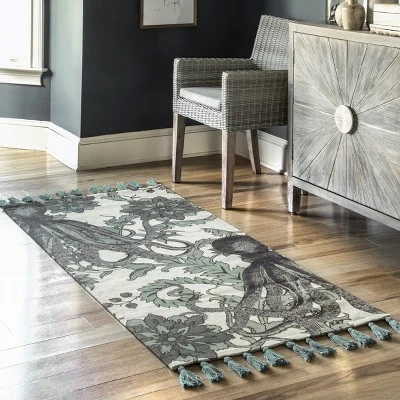 Find a superb match for your den’s coastal vibe thanks to this handmade nautical tasseled area rug. The rug’s varicolored rendition of a majestic octopus amid floral-style accents showcases an alluring display for modern decorative themes, while its flatwoven cotton construction combines its low-maintenance allure with a soft, cozy texture underfoot. Due to the handmade nature, each piece is marked by subtle but individual differences that make your rug unique. Create the home of your dreams with our easy to care for and pet-friendly area rugs.