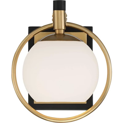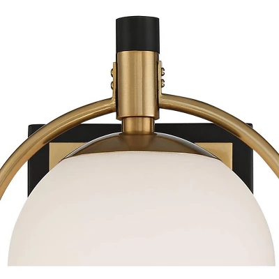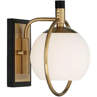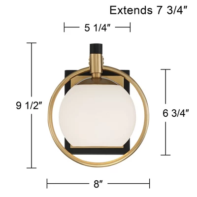 A decadent nod to Art Deco style makes this modern single-light wall sconce a perfect choice for a chic, updated bath or living space. This sconce from Possini Euro Design® blends fashionable tones of warm antiqued brass and black on metal, with the elegant simplicity of geometric shapes. A milky white globe shade reinforces the soft, dreamy focus of this extraordinary sconce. Suitable for vertical installation only.