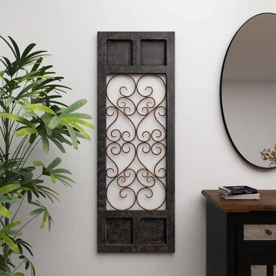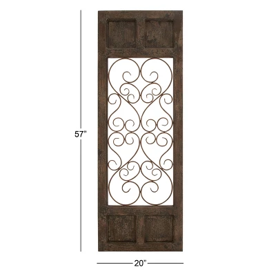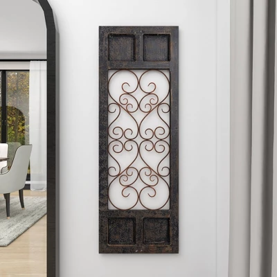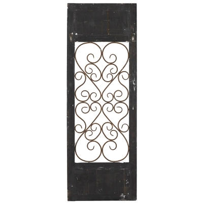 This iron and wood wall decor is ideal as an accent wall panel for the living room, the hallway, and the bedroom. This item ships in 1 carton. This wall décor is designed with intricate iron heart scrollwork. Can be hung vertically using the D-rings on the back; nails and screws not included. Suitable for indoor use only. This item ships fully assembled in one piece. This is a single brown colored wall sculptures. Traditional style.