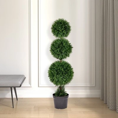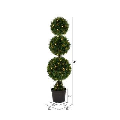 Vickerman Artificial Potted Green Ball Cedar Topiary. Featuring deep green foliage, a black plastic insertable pot, and is UV treated for outdoor use. Easy to care for, maintenance free, an occasional light dusting is all that is needed.
