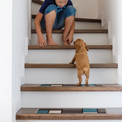 Enrich your stairs with these stunning, yet practical and decorative stair treads. The distressed geometric design adds interest and style to every step. The rubber backing provides additional safety for climbing kids and pets. At 26 inches x 8.6 inches, these machine washable treads are ideally sized for the majority of staircases.